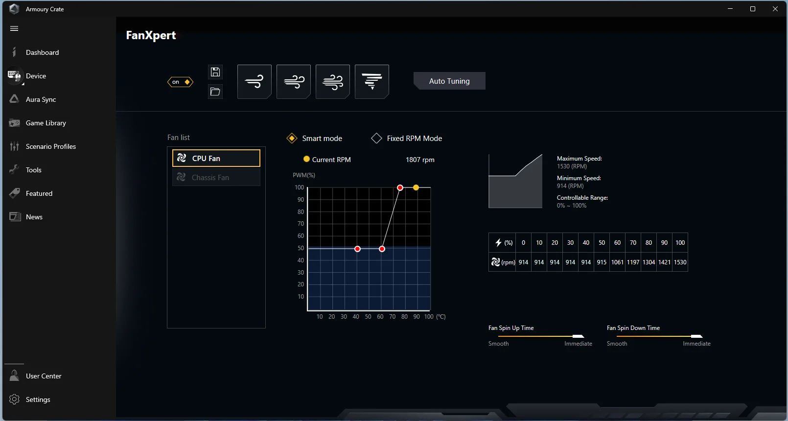 Το Armoury Crate είναι ένα αποκλειστικό βοηθητικό πρόγραμμα λογισμικού της ASUS που έχει σχεδιαστεί για να σας παρέχει κεντρικό έλεγχο των υποστηριζόμενων προϊόντων. Από ένα ενιαίο διαισθητικό περιβάλλον εργασίας, το Armoury Crate σας επιτρέπει να προσαρμόσετε εύκολα την καμπύλη ανεμιστήρα για κάθε συνδεδεμένο ανεμιστήρα μέσω του βοηθητικού προγράμματος FAN Xpert.