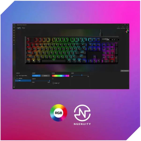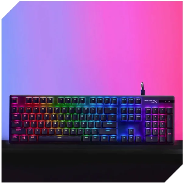 Οι μηχανικοί διακόπτες πλήκτρων της HyperX είναι κατασκευασμένοι με εκτεθειμένες λυχνίες LED, ώστε να είναι ορατό μεγαλύτερο μέρος της φωτεινής εξόδου, παρέχοντας πιο λαμπερό, εντυπωσιακό φωτισμό. Είναι επίσης ρυθμισμένοι με δύναμη ενεργοποίησης και απόσταση διαδρομής που είναι κομψά ισορροπημένες για απόκριση και ακρίβεια.