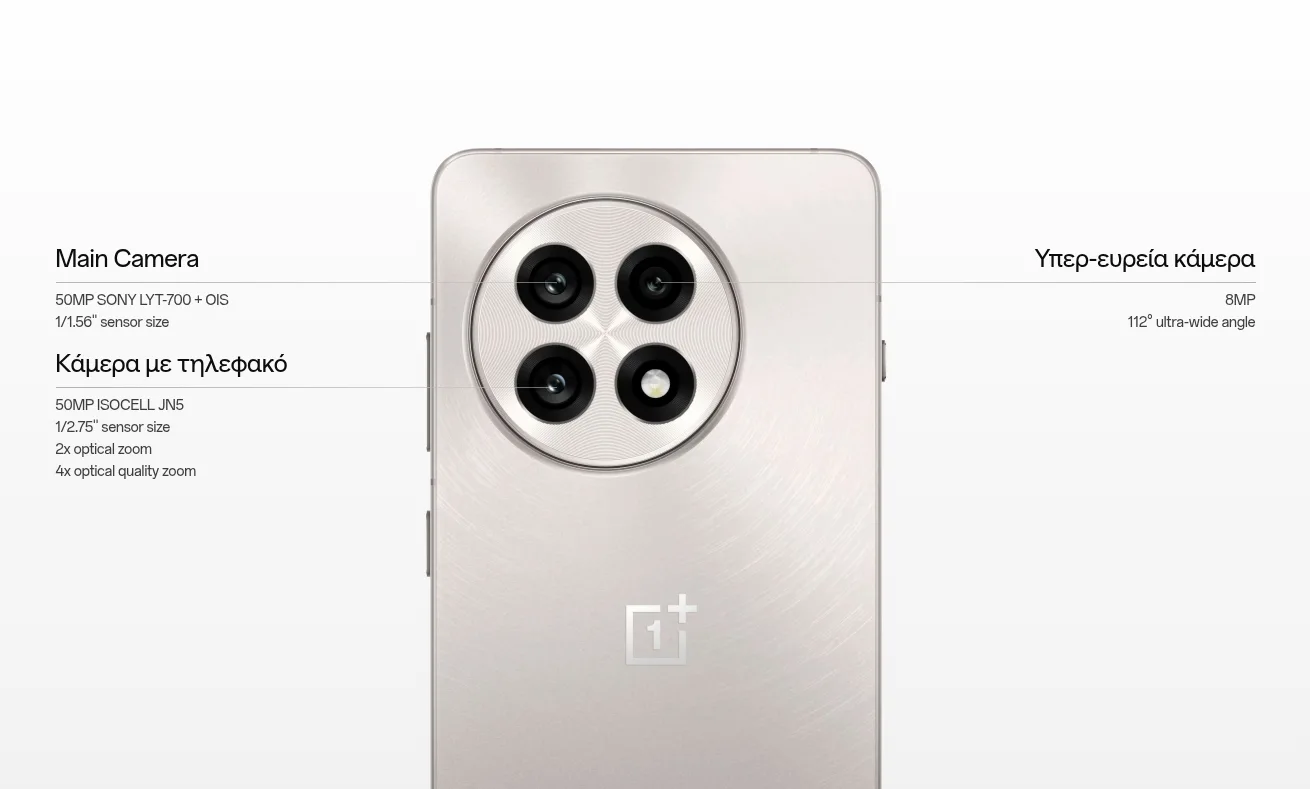 ✔ Το OnePlus 13R διαθέτει τριπλό σύστημα καμερών, συμπεριλαμβανομένου ενός κύριου αισθητήρα Sony LYT-700 50MP, υπερευρυγώνιου φακού 8MP και τηλεφακού 50MP με 2x οπτικό ζουμ, επιτρέποντας τη λήψη υψηλής ποιότητας φωτογραφιών και βίντεο.