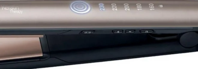 - Στο πάνω μέρος υπάρχει το λογότυπο της Remington, η ονομασία της σειράς Keratin Therapy, οι φωτεινές ενδείξεις της θερμοκρασίας και η ένδειξη κλειδώματος.