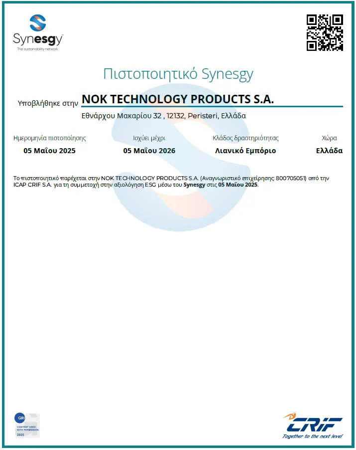 Είμαστε στην ευχάριστη θέση να ανακοινώσουμε ότι λάβαμε επισήμως το Πιστοποιητικό Synesgy, ενισχύοντας περαιτέρω τη δέσμευσή μας για υπεύθυνη επιχειρηματική λειτουργία και βιώσιμη ανάπτυξη.